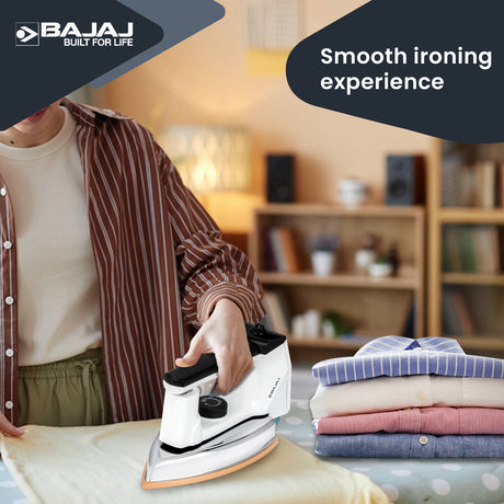 Bajajโs irons, with a 1600W heating element, deliver quick heat-up and consistent steam output up to 25g/min. The GlidePro 1600, a best iron for clothes, features a non-stick soleplate for smooth gliding across fabrics. Customers often ask about versatility, and these top irons offer adjustable steam settings for delicate and heavy fabrics. Advanced anti-calc technology enhances this iron for clothesโ longevity. The irons price ranges from โน1,000 to โน3,500, offering great value. Ergonomic design and 360-degree swivel cord make these best irons versatile. Their sleek aesthetics suit modern homes, making them a leading choice for irons online. Bajajโs best irons include a 2-year warranty. Choose these irons for clothes for reliable performance.